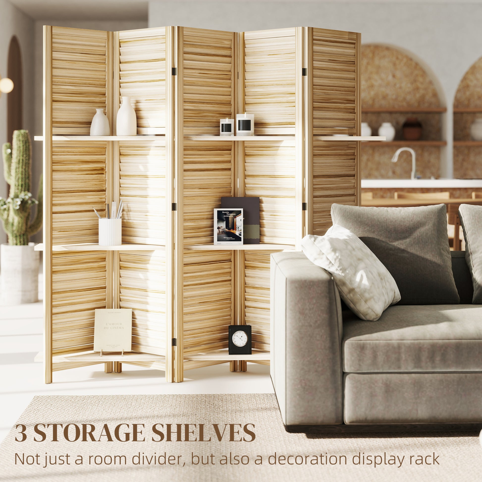5 Panel 67" Tall Wood Privacy Screen Room Divider with 3 Shelves and Folding Storage for Bedroom, Natural Wood