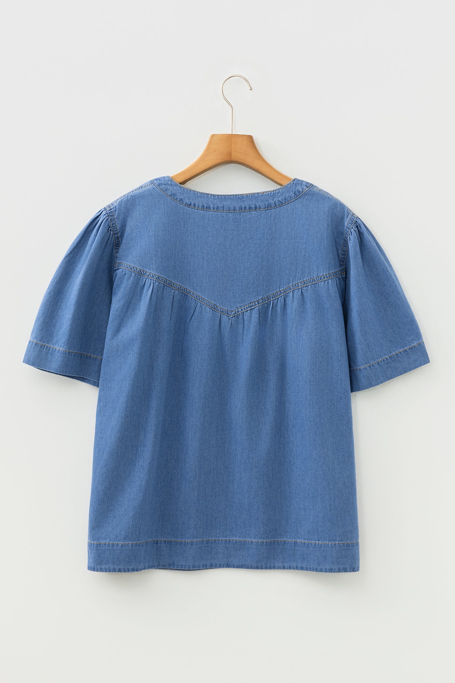 Beau Blue Seam Pleated Detail Half Button Short Sleeve Denim Top